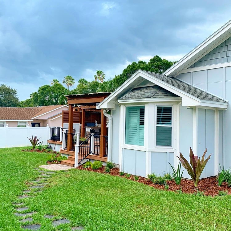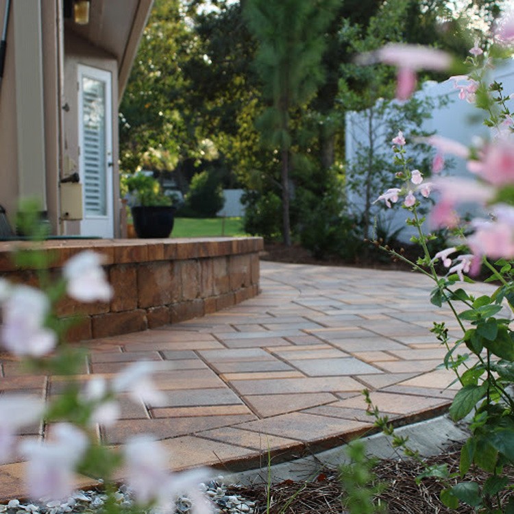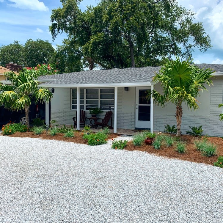 To break up the patio expanse, we settled on a raised planter that would fit an arrangement of Yaupon Holly and some groundcover. This would aid in separating the patio into two areas and reduce the “heat island effect” of too much hardscape in one area against the foundation. With this in place, we tiered the landscape down from there, creating a small network of shell paths that would include a seating area within the landscape.