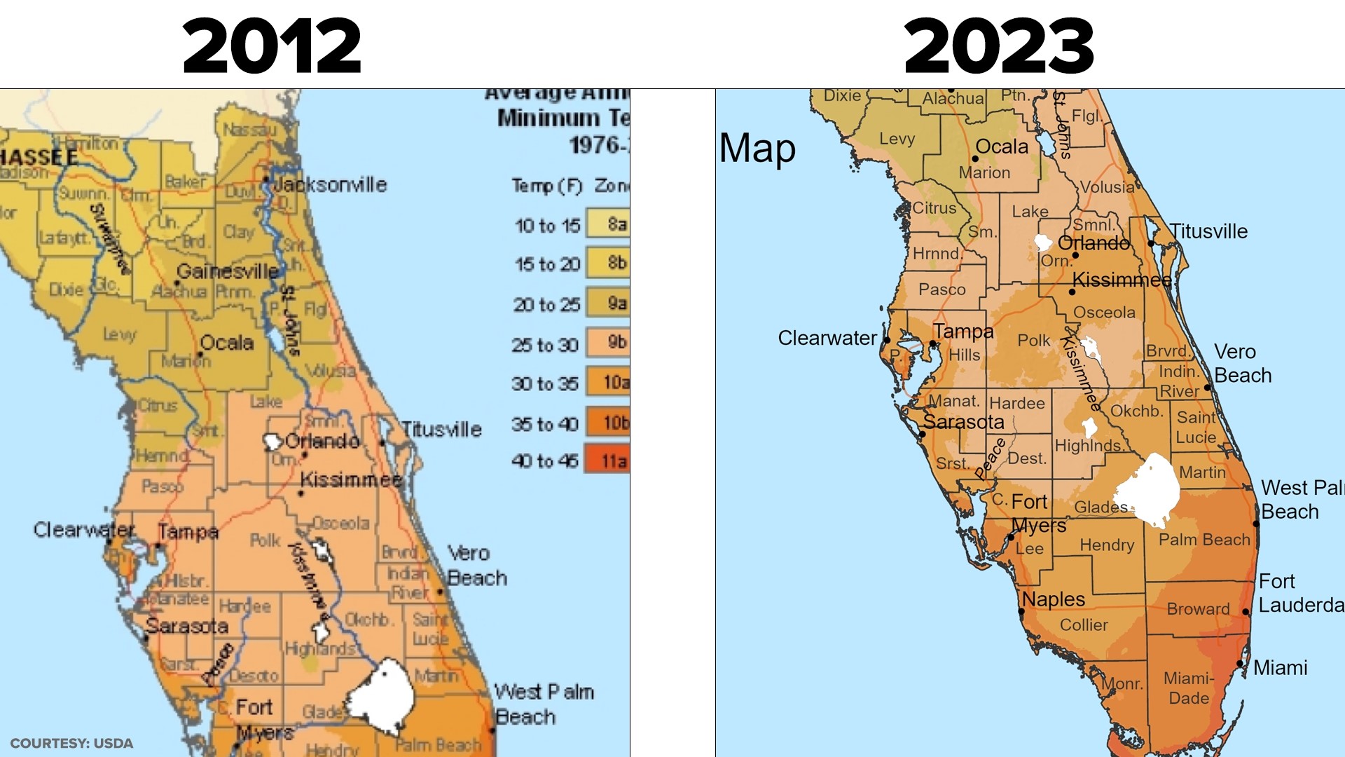 USDA Hardiness zones 2012 vs 2023. Source: WTSP.com