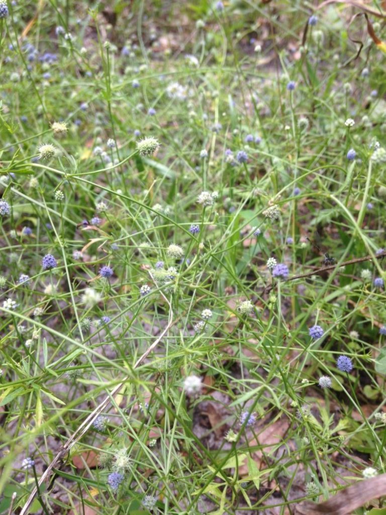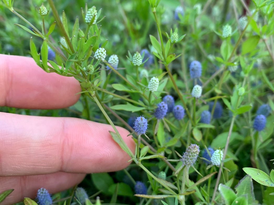 Ernyngium baldwinii is a deciduous perennial wildflower that grows along the ground. The tiny flowers are blue. It works well mixed in with other groundcovers in moist environments. Plant in part to full sun and moist to wet, rich soils. Great choice for a bog planter as it will spill over the side!