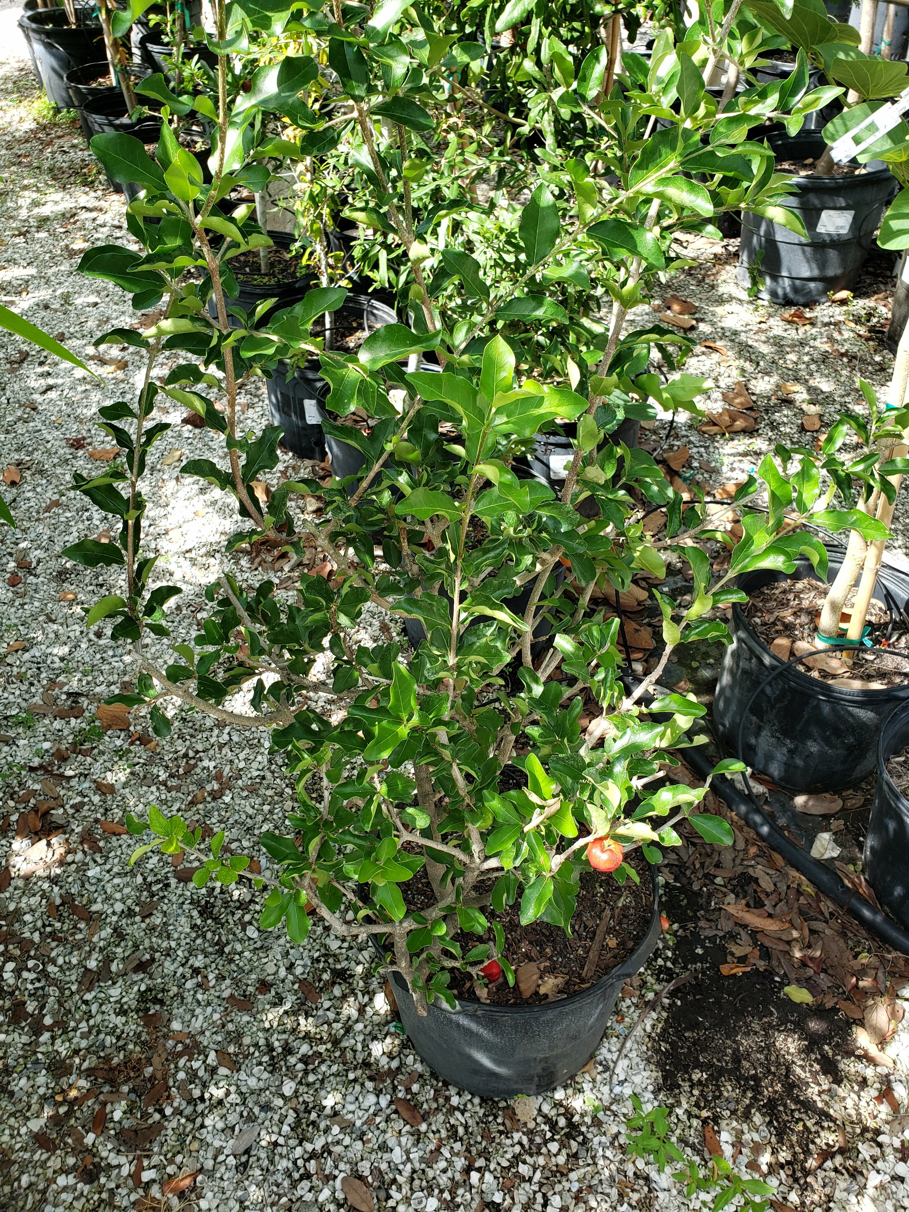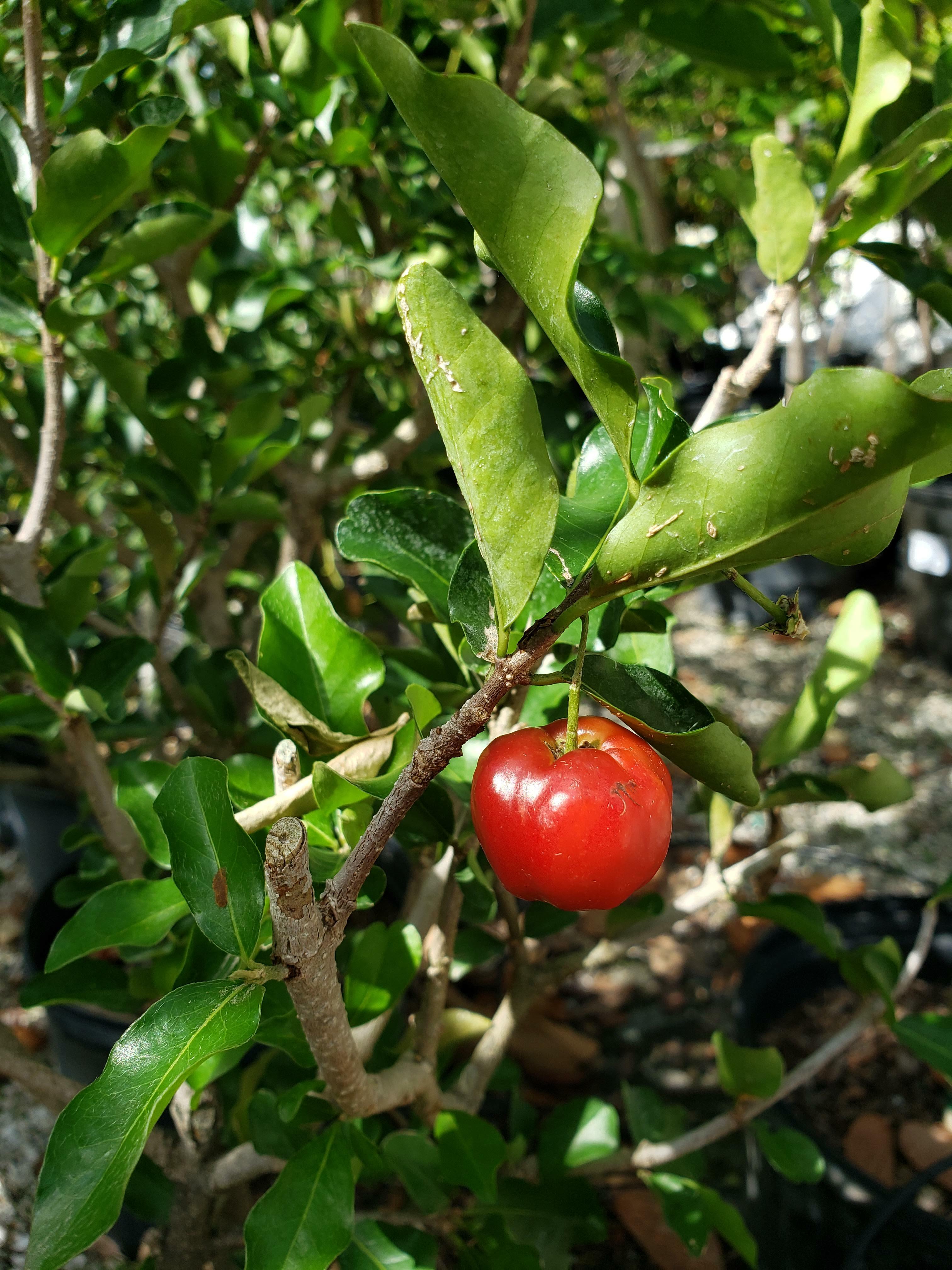 Barbados Cherry, Malpighia punicifolia, is a common tree through the Caribbean and Central America. It is a large evergreen and tropical shrub to small tree growing to 15 feet without pruning. Barbados Cherry is a fairly easy growing plant with reasonable drought tolerance. Well established plants can be sensitive to temperatures below freezing. The small pink flowers provide an ornamental element from late spring through the fall. The medium green leaves are approximately 2 inches long. The fruit is a bright red cherry like fruit. It is mildly tart and is high in vitamin C. It can be used fresh, frozen, or used in Jams and Pie fillings. Barbados Cherry should be planted in well drained soil and in full to mostly full sun exposure.