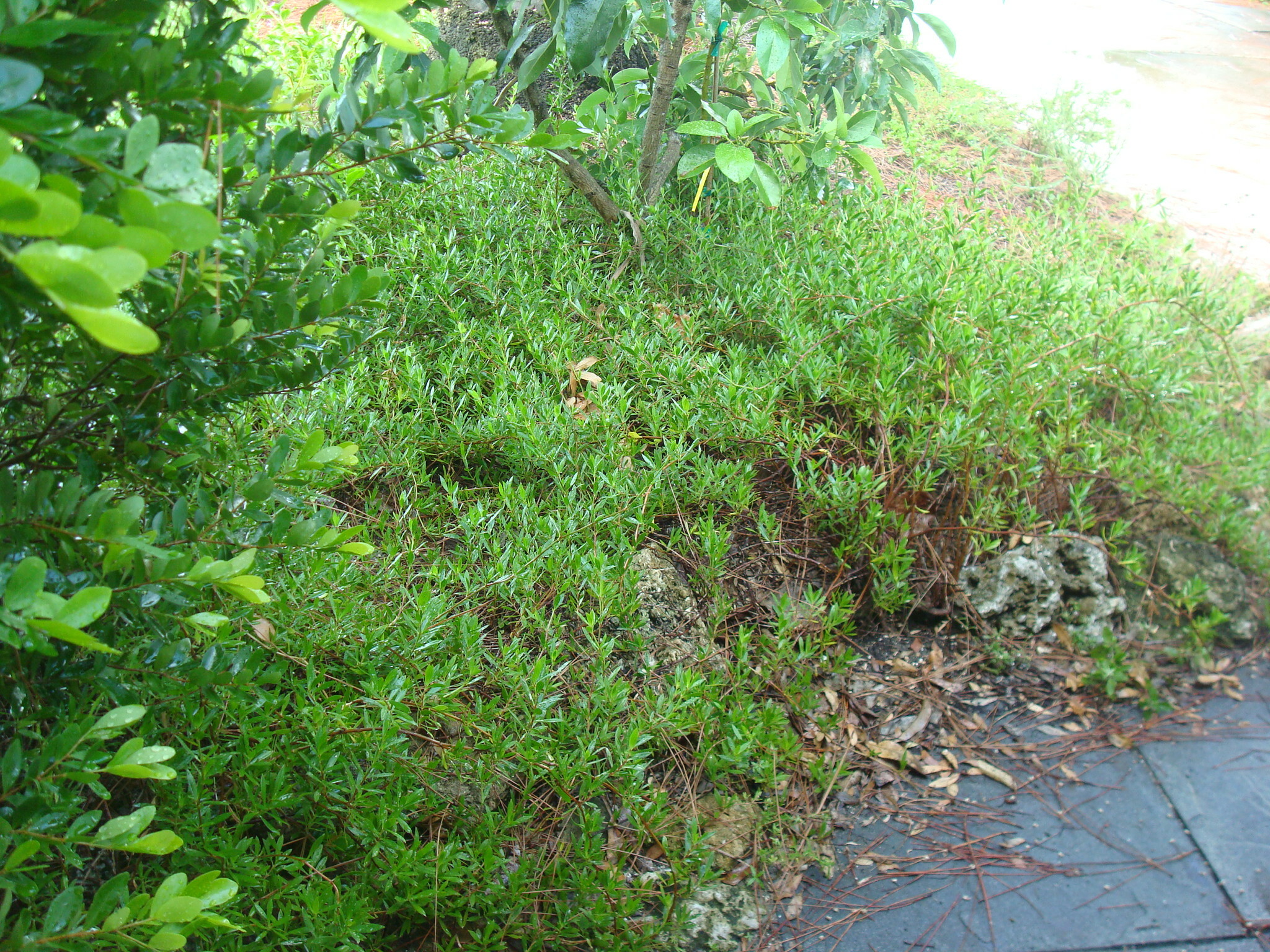 Beach Creeper also known as Golden Creeper, Ernodea littoralis, is a prostate plant that can spread and root indefinitely. It is very hardy with drought and salt air and wind. It is adapted to very poor soil. Beach Creeper is a great plant to use for ground cover in mostly frost free locations in full sun to filtered sun. The leaves are narrow and glossy and are approximately 1 inch long. The plant produces a golden yellow fruit after the small white to light pink flowers that can be produced throughout the year. Birds are attracted to the fruit as a food source. There is a unique dark pink flowered form from the Florida Keys.