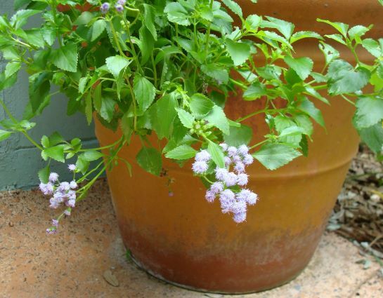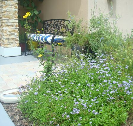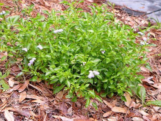 Beach Mistflower, Ageratum maritimum, is a mounding, decumbent perennial with 'fuzzy' small clusters of lavender, blue, or white flowers. The plants grown in cultivation are lavender. The flowers that are produced throughout the warm months are attractive to skipper butterflies. This plant, besides being a good bedding plant in well-drained landscape sites with partial to full sun also make good container plants to cascade down the side of a pot.