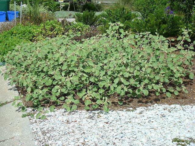Beach Tea, Croton punctatus, is a small shrub or ground cover from the deeply drained dunes of the west coast of Florida. It is a highly attractive plant with silver-green leaves that stand out against tan stems. It will grow much broader than tall with maximum height around 2 feet and spread up to 3 to 4 feet. This is a really interesting plant for accent in a landscape with it's low habit and silver coloration. It a great choice for full sun in coastal or deeply drained landscapes where a highly wind and salt tolerant plant is desired. Beach Tea will not tolerate poor drainage and care should be taken to place this plant properly with that consideration. Beach Tea can be short lived (2 to 3 years), but they tend to seed and recycle themselves.