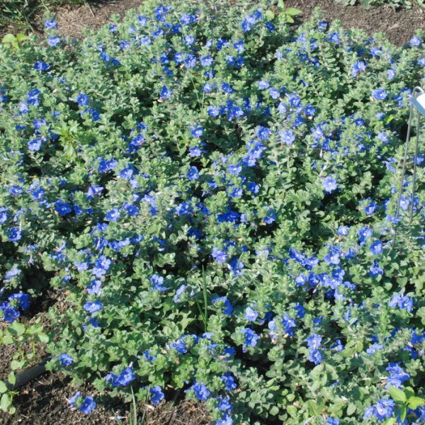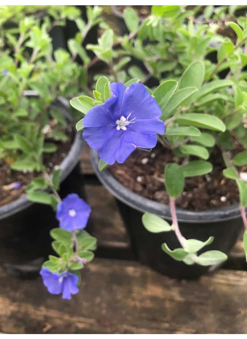 'Blue My Mind' Blue Daze, Evolvulous glomeratus, is a low growing, spreading short-lived perennial that blooms with light blue flowers throughout the warm months. It likes full sun and is moderately drought tolerant once established, but may need supplimental water during periods of drought. They make a great bedding plant for a flower garden through the Summer and can also be used as potted plants, especially hanging baskets.