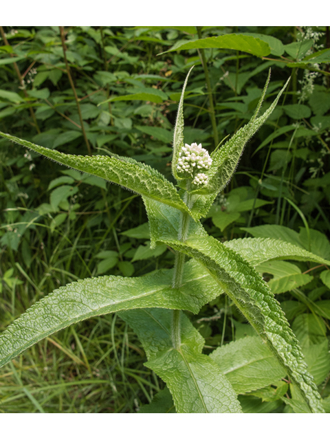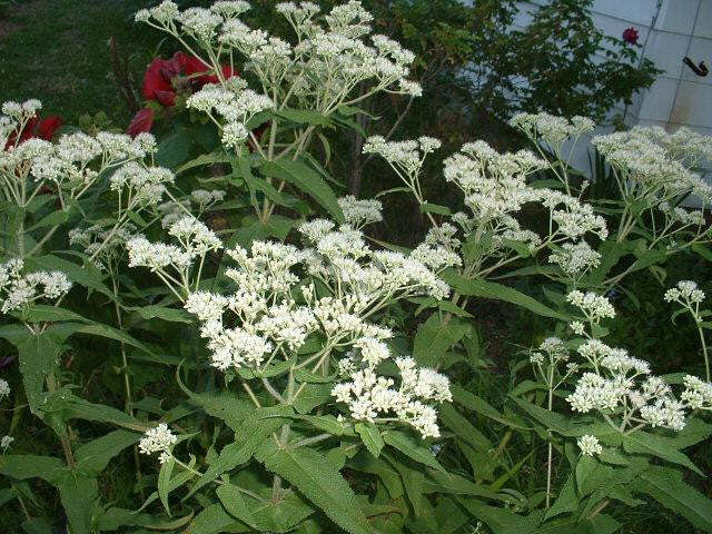 Common Boneset, Eupatorium perfiolatum, is a perennial wildflower that blooms spring through fall. It reaches 2-3 feet high and wide. Prefers part to full sun and well-drained, sandy soil. The flowers are white with unique flower heads. Easily propagated from seed.