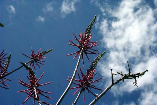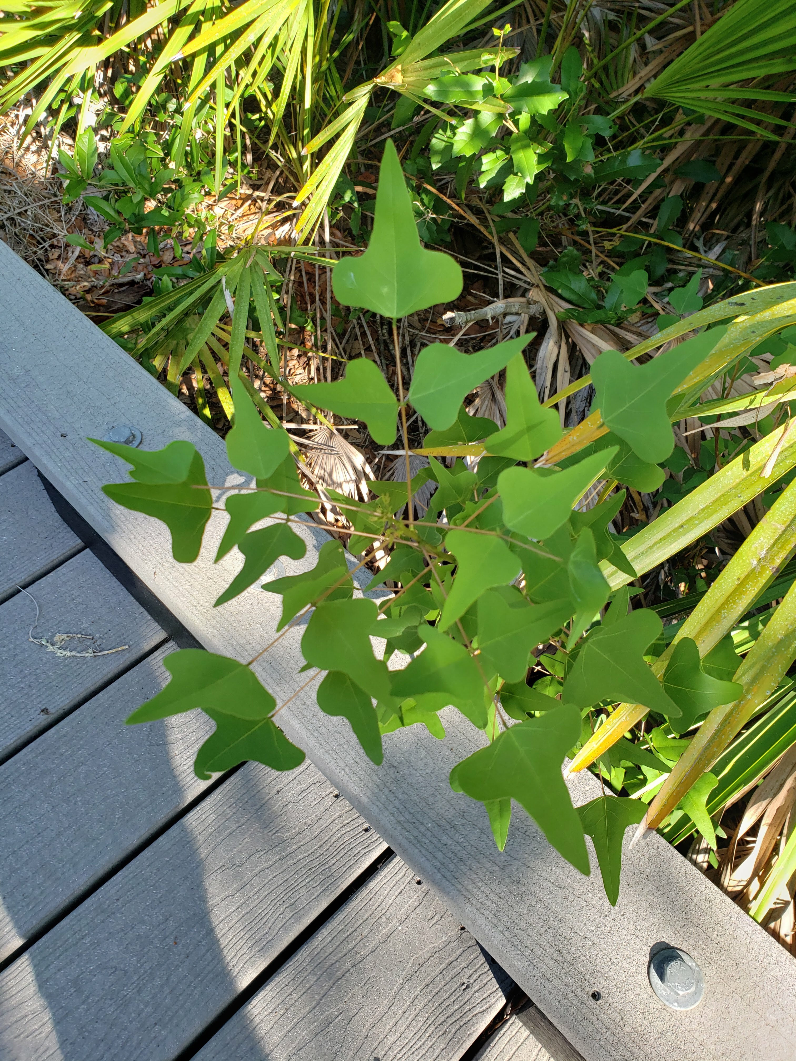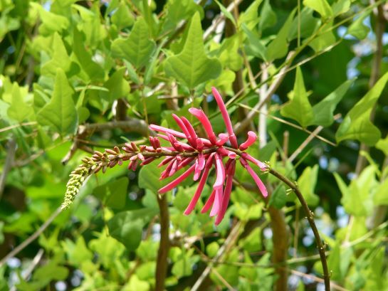 Coral Bean, Erythrina herbacea, is a deciduous and thorny, low shrub to small tree with many herbaceous stems arising from the woody lower stem and perennial root. They have legume pods containing several bright red toxic beans. The striking terminal spikes of red flowers in the spring attract migrating Hummingbirds and are typically bore before spring foliage emerges. The natural distribution is throughout much of Florida and beyond. The plants die back to the ground in the winter in colder areas. It is very thorny with re-curved spines. It is tolerant of salt air, partial shade, or full sun. Very drought tolerant. As a thorny plant, it is good for background and security barriers.