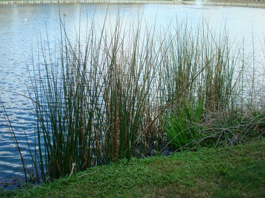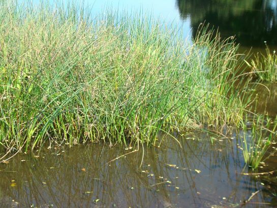 Giant Bulrush, Schoenoplectus californicus, is an emergent wetland plant that grows to 6ft. It needs cosistantly moist soil and prefers full sun. The seeds are eaten by ducks and rodents, and the dense foliage provides cover for wildlife. Useful for lakeshore stabilization, water quality improvement, wetland creation/restoration, and as a background plant for wetland ponds.