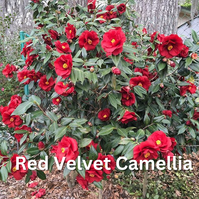 Red Velvet is a winter bloomer with deep red, double blooms. It reaches 8-10 feet high and 6-8 feet wide.