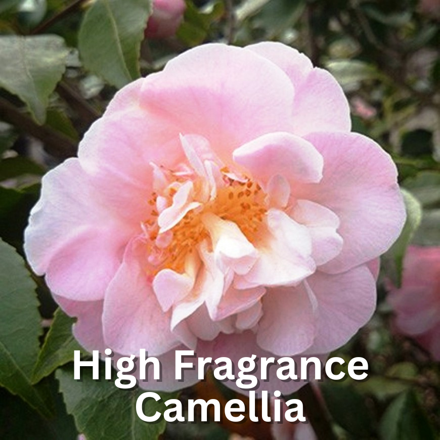 High Fragrance has large, semi-double light pink flowers that bloom late fall through early spring. It is known for it's strong, rose-like fragrance. It grows 5-8 feet high and wide.