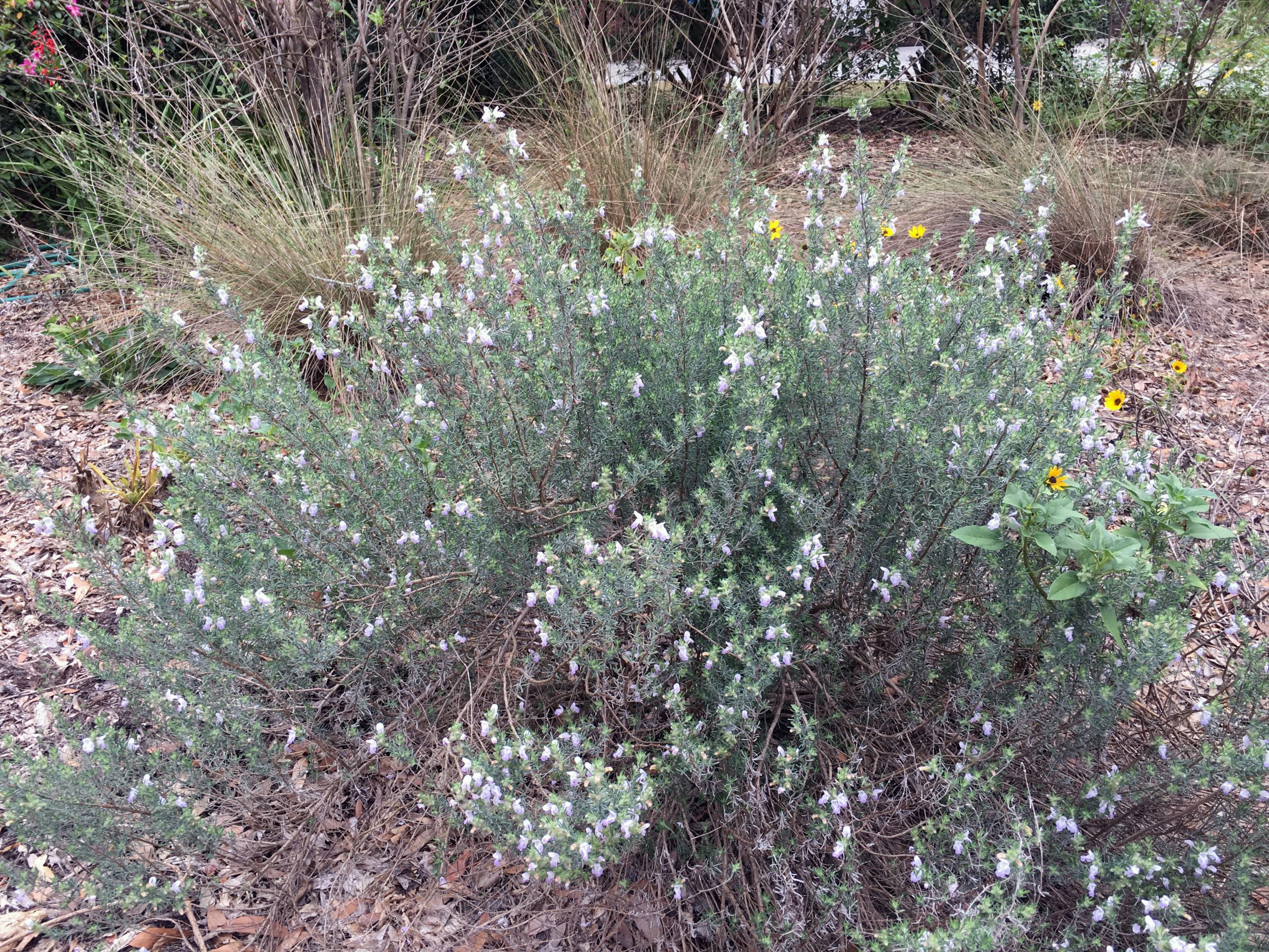 Conradina grandiflora is a native perennial wildflower. It reaches 2-3 (4) ft tall by 1-3 ft wide. With very aromatic foliage, it makes a great border plant along walkways. White flowers with purple specks in the center. Full sun and dry soils. Native to FL's East Coast Scrublands and Coastal Strands. This is a rare plant listed as threatened by the State of Florida.