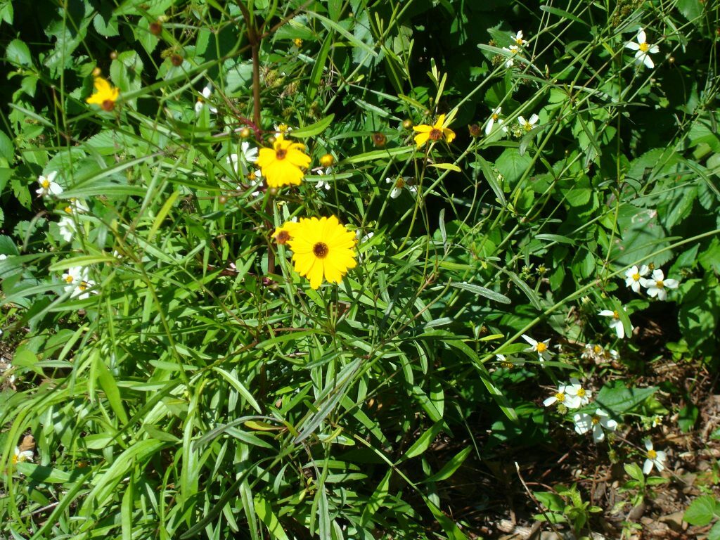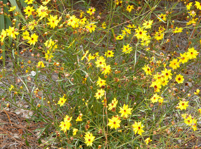 The Coreopsis genus is the state wildflower of Florida. Leavenworth's Tickseed (Coreopsis leavenworthii) is an annual that reseeds and perpetuates continually. It grows to around 2 feet in in height and has a delicate appearance with its thread-like foliage and stems. Its flowers are small with a dark center, and organized into larger heads resembling a single, radially symmetrical flower cupped by a ring of green bracts. Tickseed blooms throughout the warm months of the year in moist to wet sites in sun.