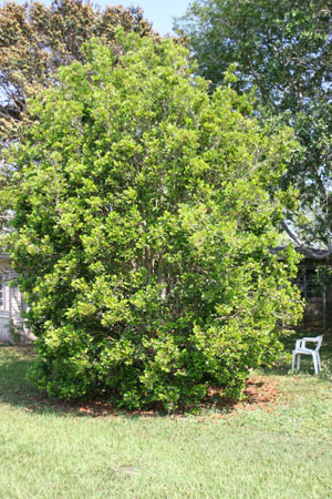 A large, evergreen shrub that can be used in hedges or as a specimen. Plant in part-full sun with average soil moisture. White flowers bloom in summer with small, black, edible berries ripening in early fall. Recommended for zone 10a due to cold sensitivity. State endangered due to rockland habitat loss.