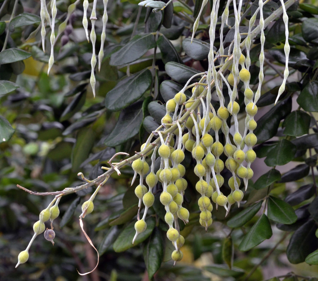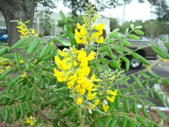 Necklace Pod, Sophora tomentosa var. truncata, is an evergreen, coastal shrub with arching stems and branches that hold long compound leaves, creating a soft lacy textured plant. The 8-16 inch spires of showy yellow flowers are racemes arcing off the branch tips and can be produced almost any month of the year. This shrub is hardy to about 20 degrees Fahrenheit, and is very drought and poor soil tolerant. Additionally, it grows quickly and is very salt tolerant and tolerant of short periods of salt water flooding.