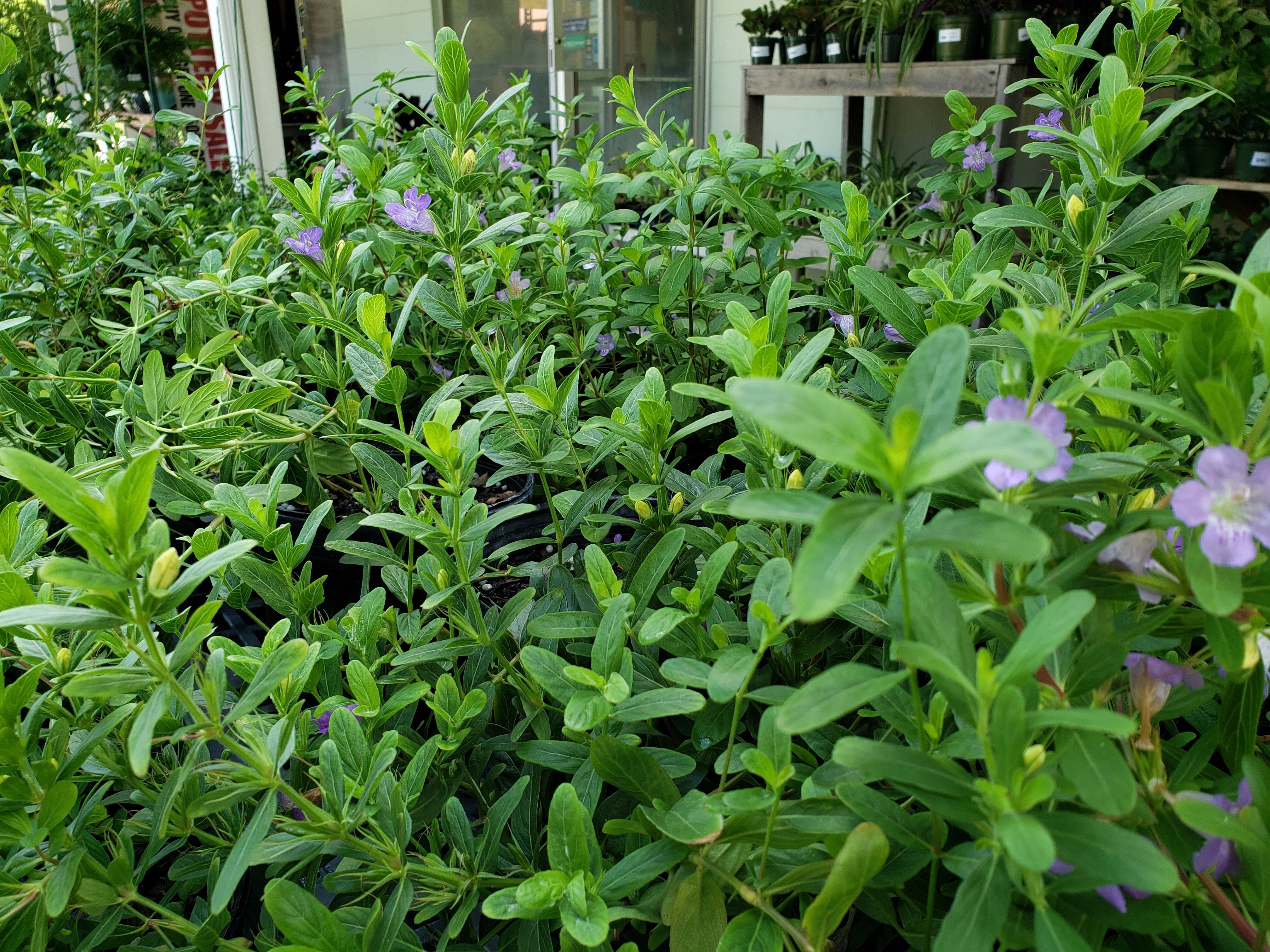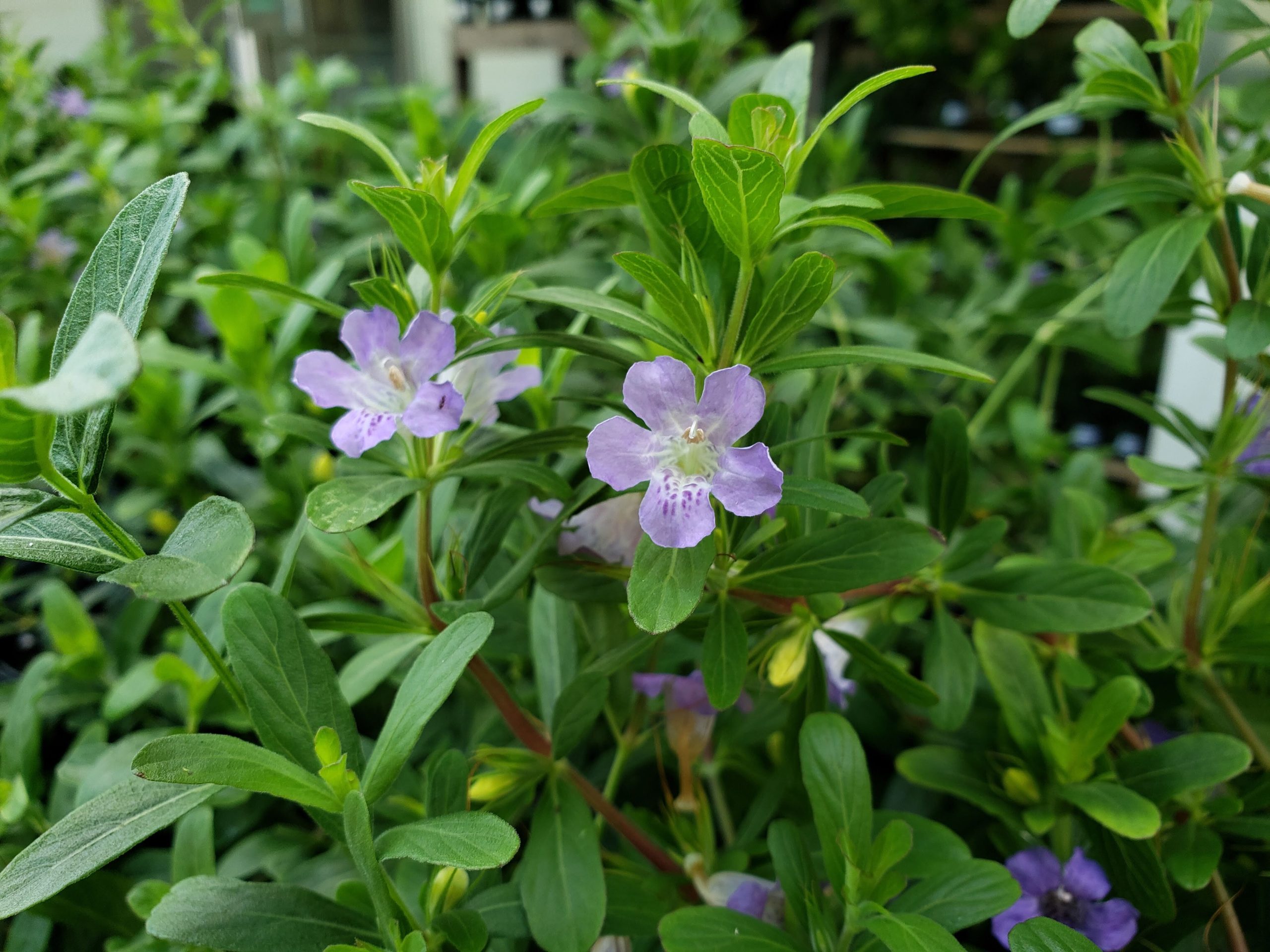 Oblongleaf Twinflower or just Twinflower, Dyschoriste oblongifolia, is a native perennial wildflower that makes a great bunching wildflower or groundcover. This species can grow to about 12" tall and spreads along the ground, and is better in sun as opposed to its shade loving relative, Dyschoriste humistrata. This cover plant in dry to average conditions, but may need supplemental watering during periods of drought. The small trumpet shaped lavender blooms can occur all year in warm areas and flowering is heightened during the warms months. The small dark leaves are dense and create a cultured look in the landscape.