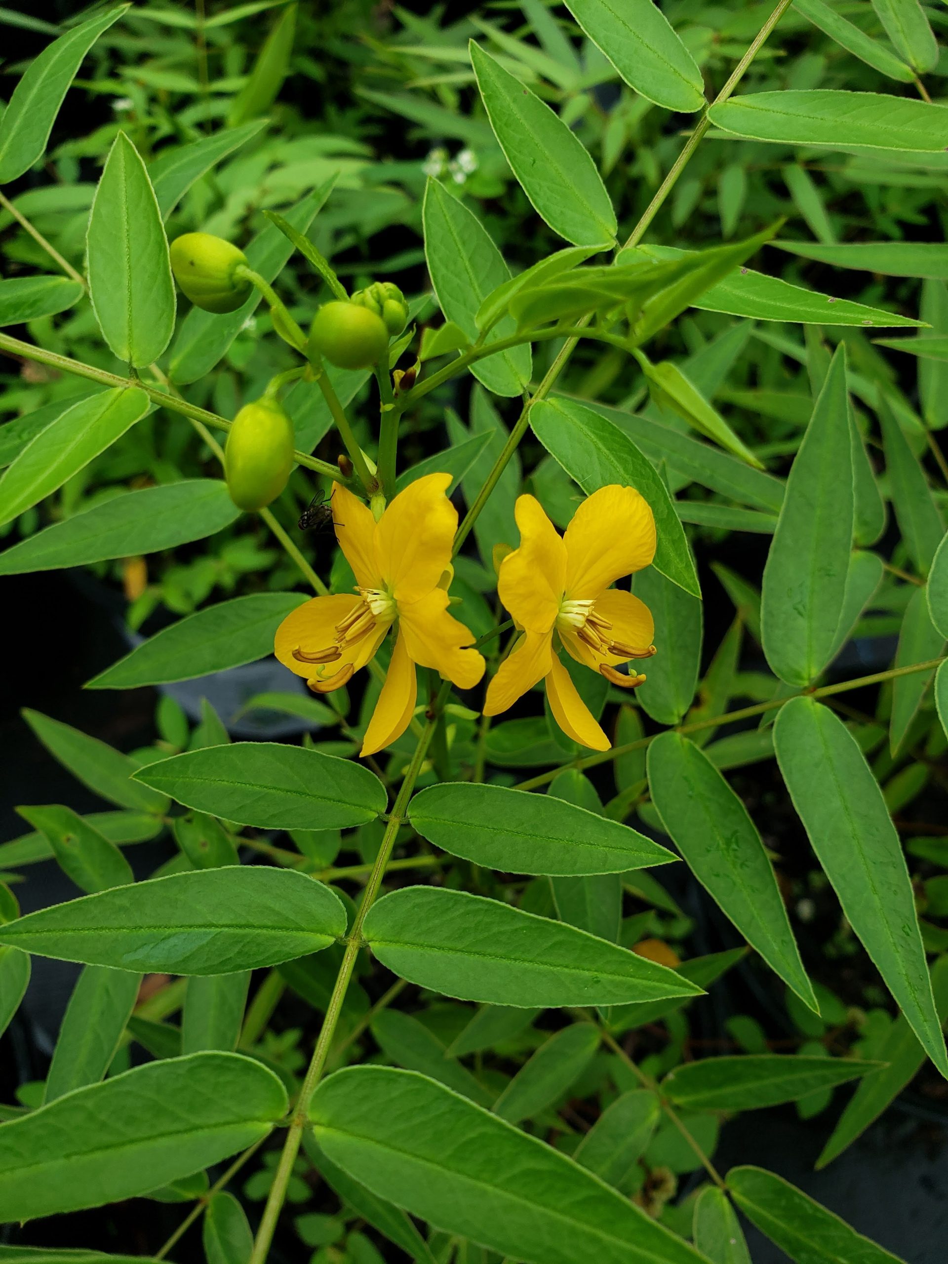 Privet Cassia, Senna ligustrina, grows about 6-7 ft. in height about the same in spread. It has medium green elliptical leaves and the plant has a soft lacy texture. It has a yellow showy flower clusters on the end of the branches in the fall and spring. Its fruit is a dry brown pod (legume). It grows quickly and prefers full sun to partial sun in well drained soil. It is a bit more cold hardy than closely related Bahama Cassia. This is a great butterfly plant since it is a host for several species of Sulfur Butterflies and is also attractive for nectar. This is a fairly easy growing plant.