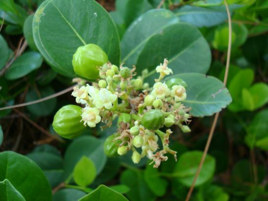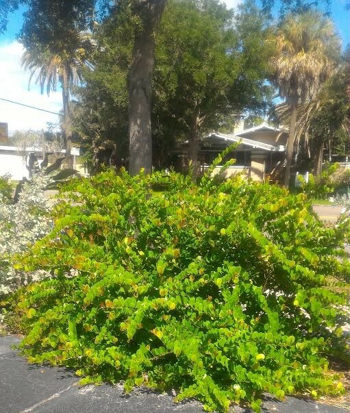 Red-tip Cocoplum, Chrysobalanus icaco, can quickly grow into a large bush or small tree growing up to 14 feet. Its foliage is nearly round, shiny, dark-green, leathery and very ornamental with the new growth tips displaying a bronze-red coloring. The fruit are edible, dark purple plum-like fruit. Coastal forms of Cocoplum are known as Horizontal or Dwarf Cocoplum and are more salt tolerant and produce a white to pink colored edible plum. The flowers are a small and creme colored in spring and early summer with the fruit following shortly after in the summer. It is a plant utilized for honey production. It will tolerate short periods of inundation. Red-tip Cocoplum will grow in full sun to shade and it becomes very drought tolerant after establishment. Cocoplum can be very frost sensitive. They take pruning well and are easy to grow as a popular and widely used native ornamental. Larval host for Epicorsia moths.