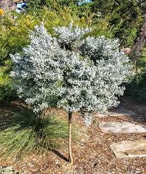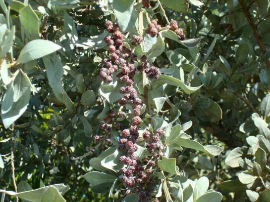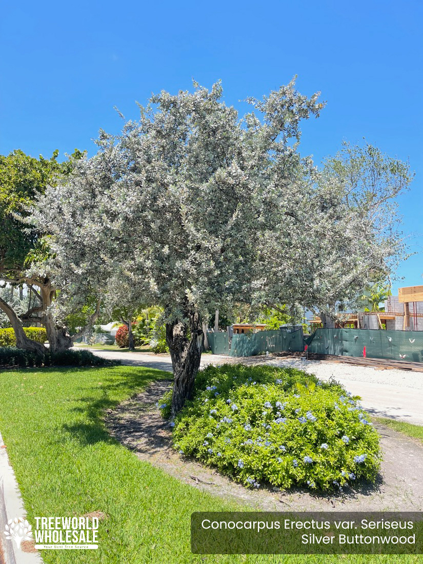 Silver Buttonwood, Conocarpus erectus var. sericeus, typically will grow to 15-25 feet in height, sometimes larger. It is a medium tree or large shrub with an open crown to dense crown with pruning. Its leaves are alternate, 2-4 inches long, leathery, and covered with silvery hairs. Flowers are green 'button-like' clusters on the branch tips and the cone-like fruit are made of many small dry seeds. It requires full sun and is used as an accent, hedge, screening plant, or specimen tree in residential and commercial landscapes along the coast. Buttonwoods are the 'fourth' Mangrove and as such, are highly wind and salt tolerant, including inundation tolerance for front line water front landscapes. This is a very popular native for its colorful ornamental foliage.