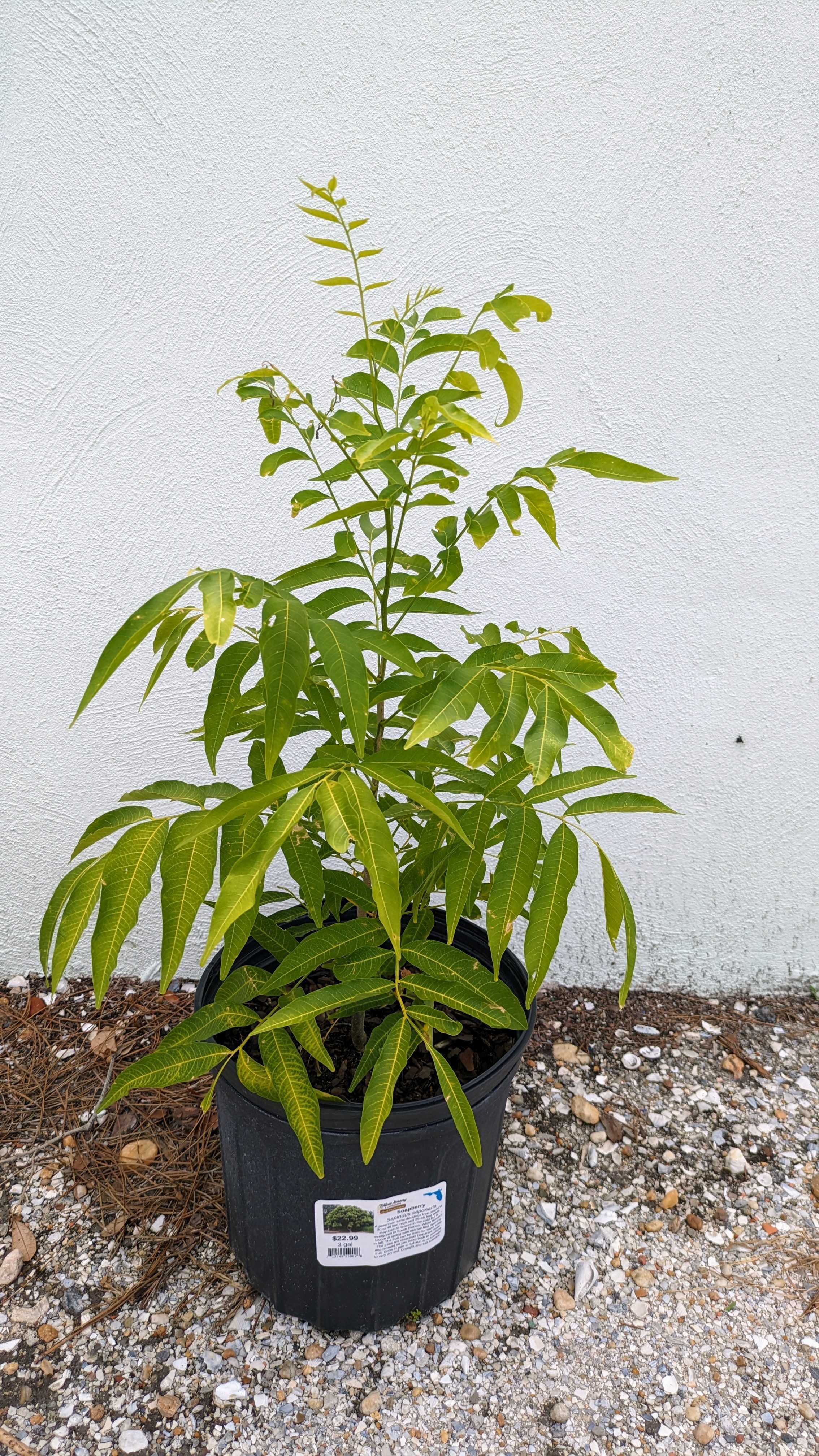 Soapberry, Sapindus saponaria, a perennial, semi-deciduous tree reaching 30-40 feet high and 25-35 feet wide. May lose its leaves in the cold but is evergreen in South Florida. White flowers bloom in spring with orange fruit ripening in fall. The fruit can be used to make soap. The trees are dioecious (separate male and female) so you need both to produce fruit. Grow in part to full sun and average to very dry soil. Drought and salt tolerant.