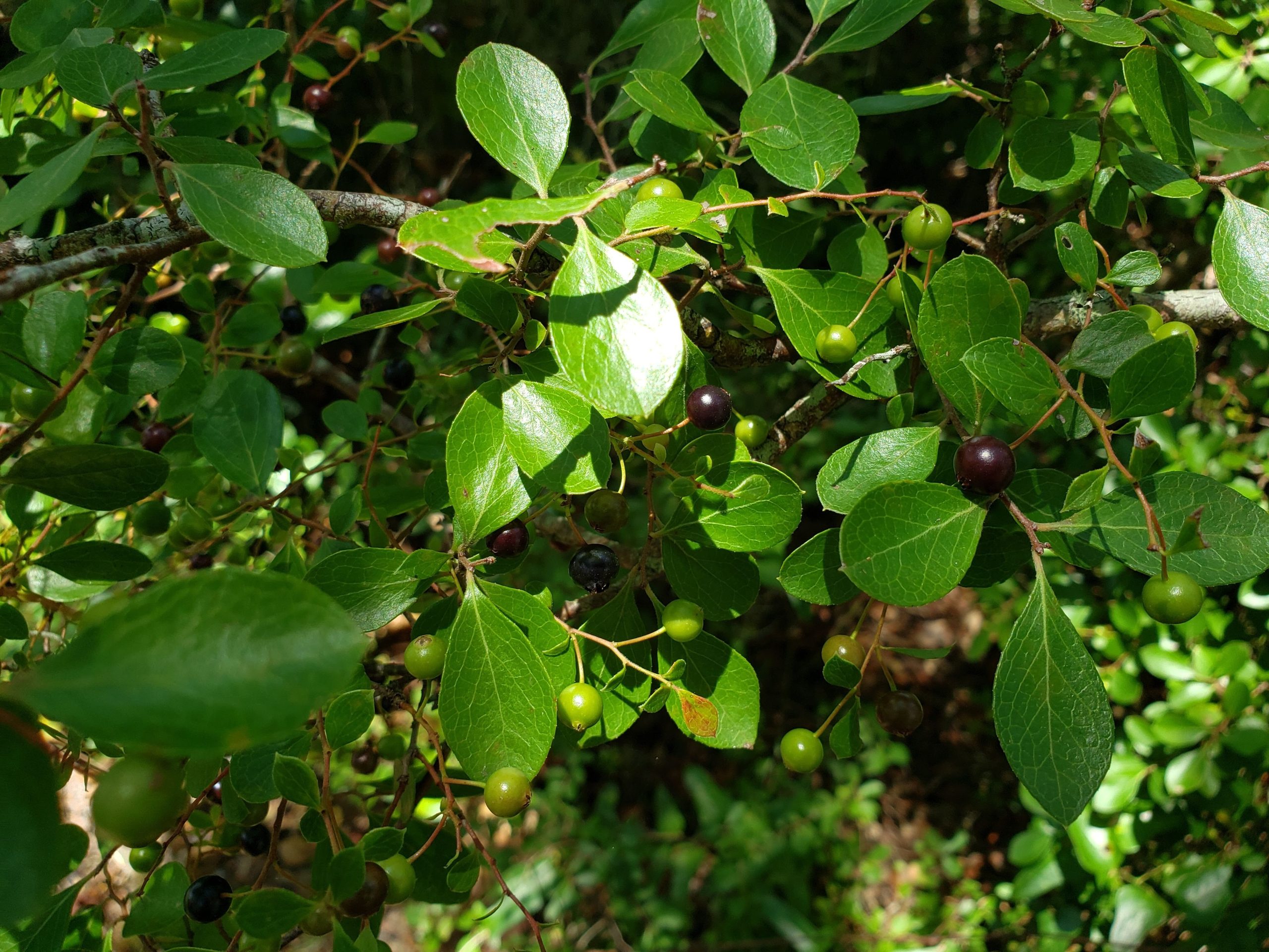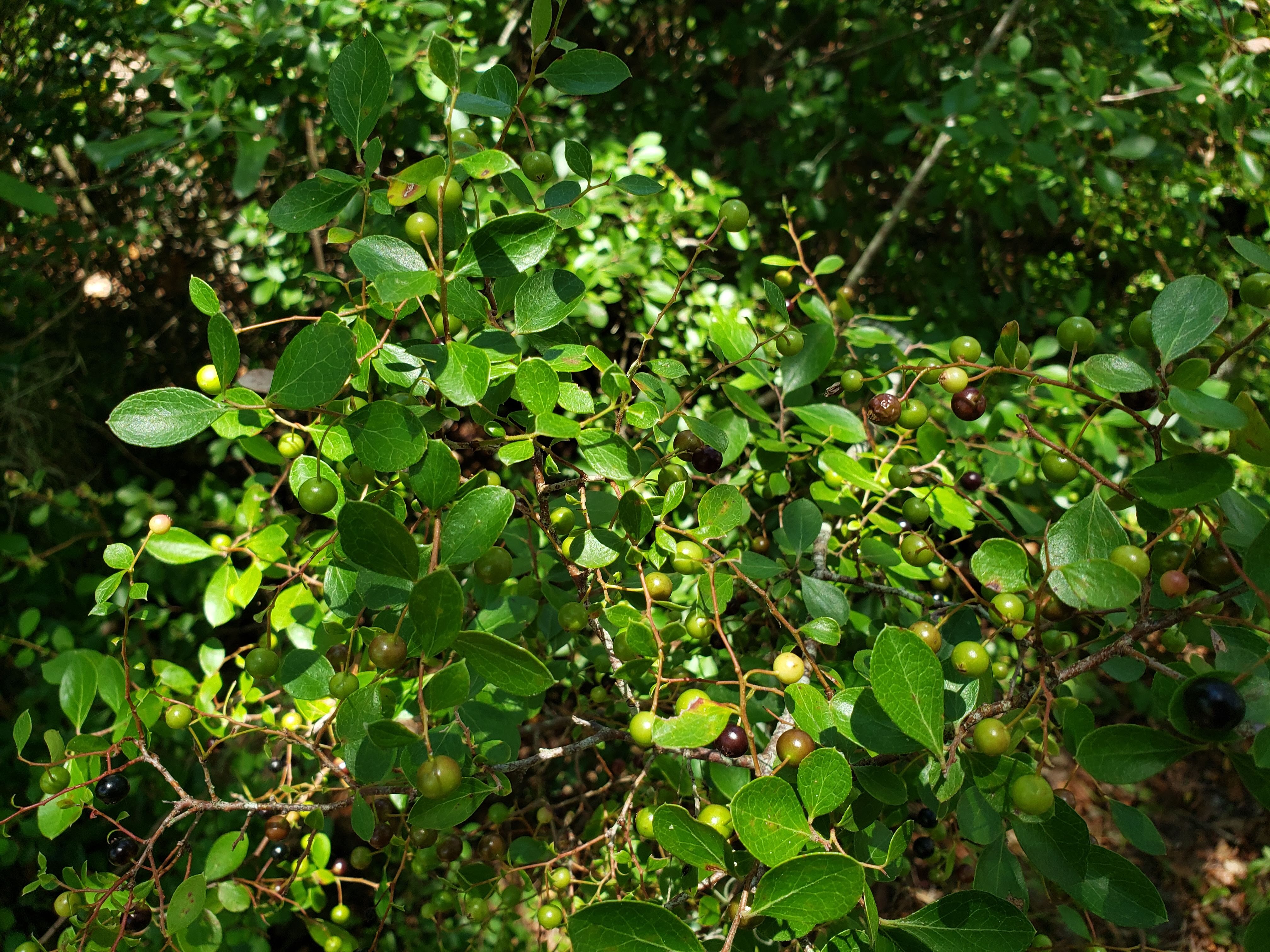 Sparkleberry (Vaccinium arboreum) is a well loved deciduous large shrub or small tree maturing from 12 to 25 feet. It is the largest growing of the Blueberry family in North America.With a little cool weather, the leaves will give some late fall color before dropping for the winter and it displays ornamental red peeling bark. Spring flowers resemble tiny, white bells. The fruit has thin, slightly sweet pulp and large seeds consumed by wildlife. The purple berry is shiny and its appearance gives it the common name Sparkleberry. Butterflies and birds are attracted to its flowers and fruit. Plant in moist, sunny locations. Sparkleberry is not as demanding of acidic soil condition as other Blueberries and although it is slow, it should be used in landscaping more often.
