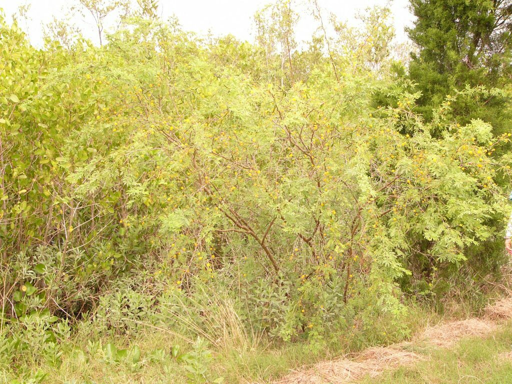 Sweet Acacia (Vachellia farnesiana var. farnesiana) is a fast growing, 15-20 foot multi-trunked large shrub or tree. Branchlets are spiny and support extremely fine divided leaves. Showy, very fragrant, deep yellow flowers in globose, pom pom like heads are produced in the fall. Fruit is a reddish brown to black woody pod 1 1/2 to 3 inches long. This unique plant is coastally adapted and tolerates dry sandy soils in partial to full sun.