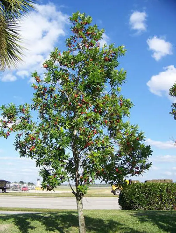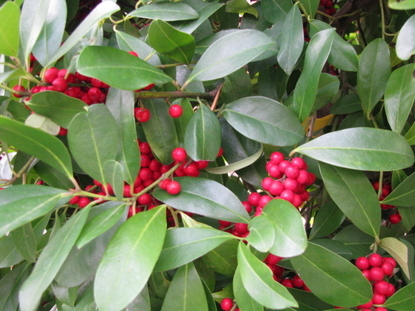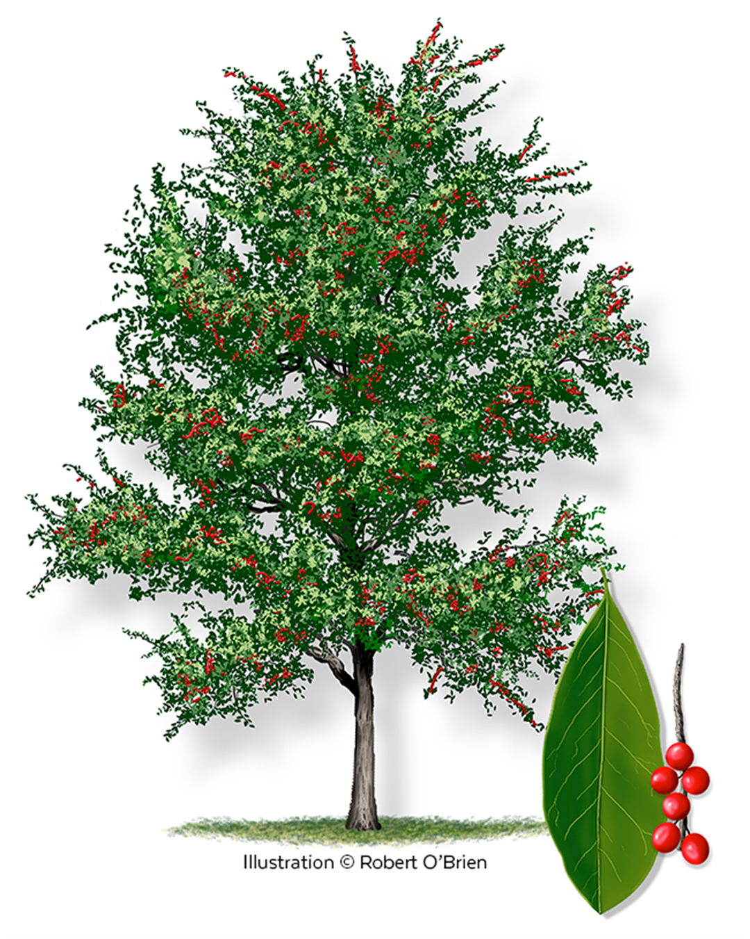 Dahoon Holly, Ilex cassine, slowly reaches 25-35 ft. high and 12-15 ft. wide. Typically it is a medium size broad-leaf evergreen tree. It is planted as an ornamental for the evergreen foliage and profuse red fruit used in Christmas decorations or as a food attraction for songbirds. Pollinators are drawn to the small spring blooms. Be sure to plant female trees for the berries and male trees for pollination to get the berries. Plant in average to moist sites in full to partial sun as a good wildlife plant for enclosure or screening, or as a specimen tree.