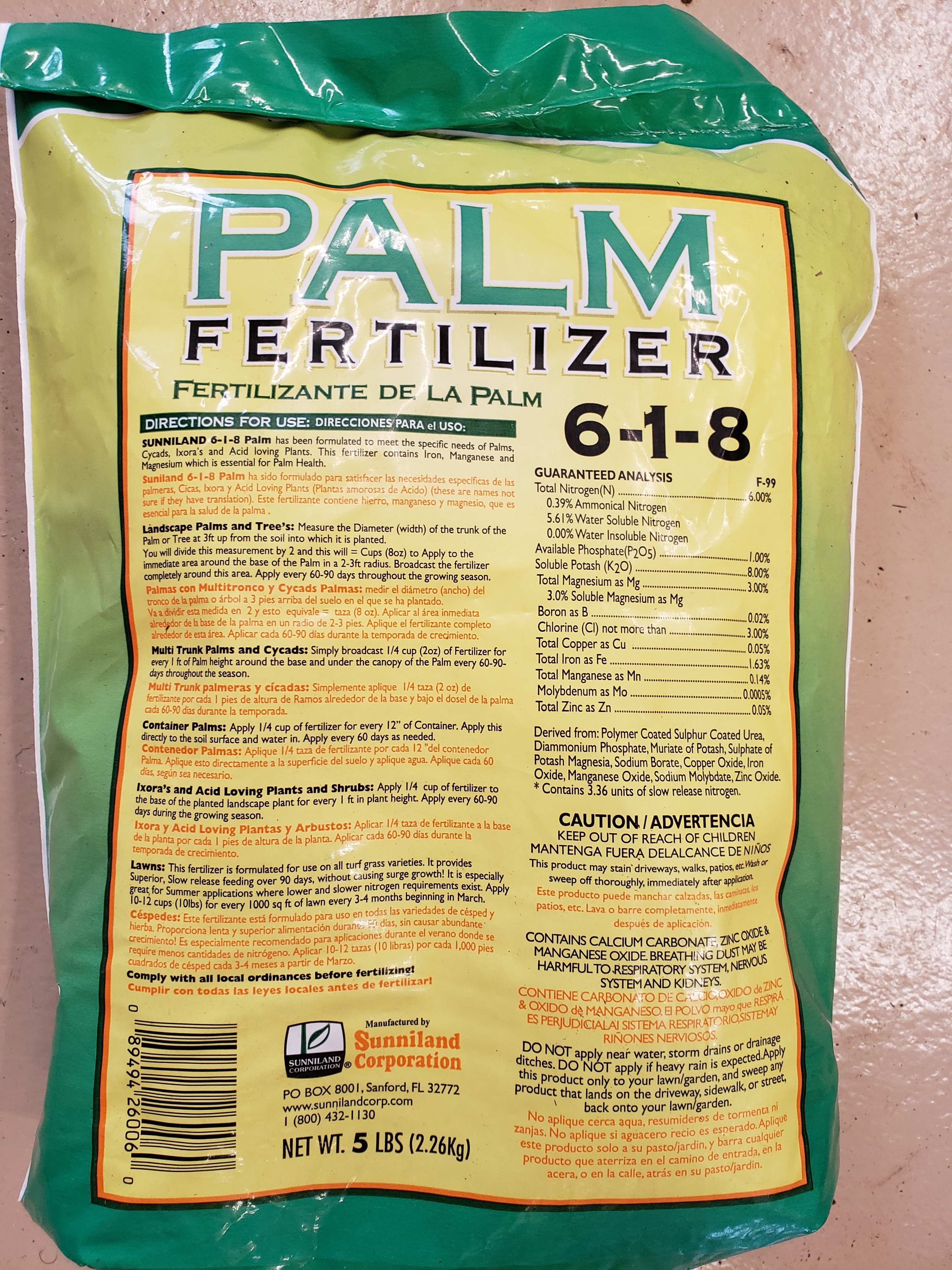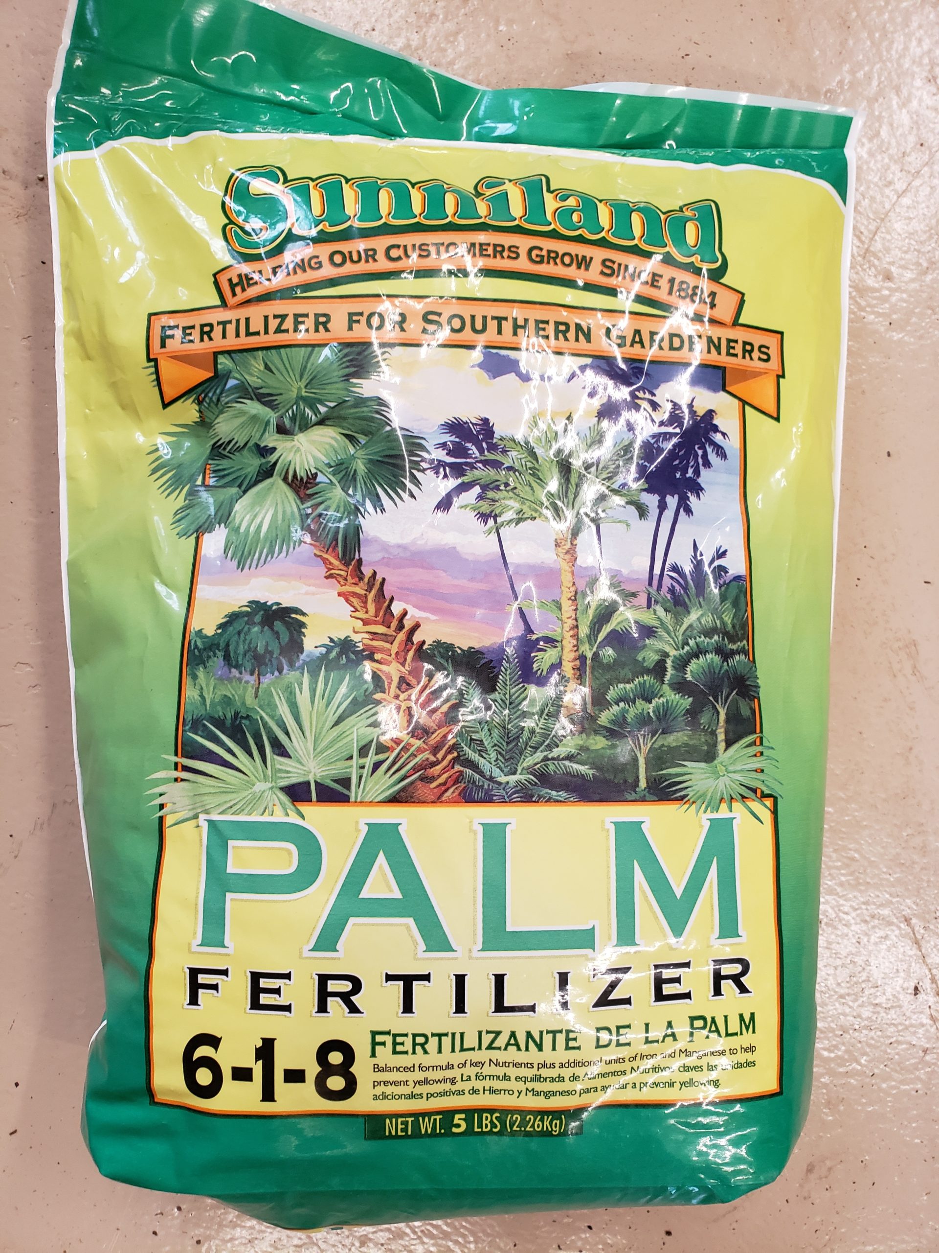 Sunniland 6-1-8 Palm fertilizer is formulated to deliver the required nutrients for healthy Palm and tropical species. Includes Iron and Manganese to help prevent yellowing, as well as containing essential micronutrients.